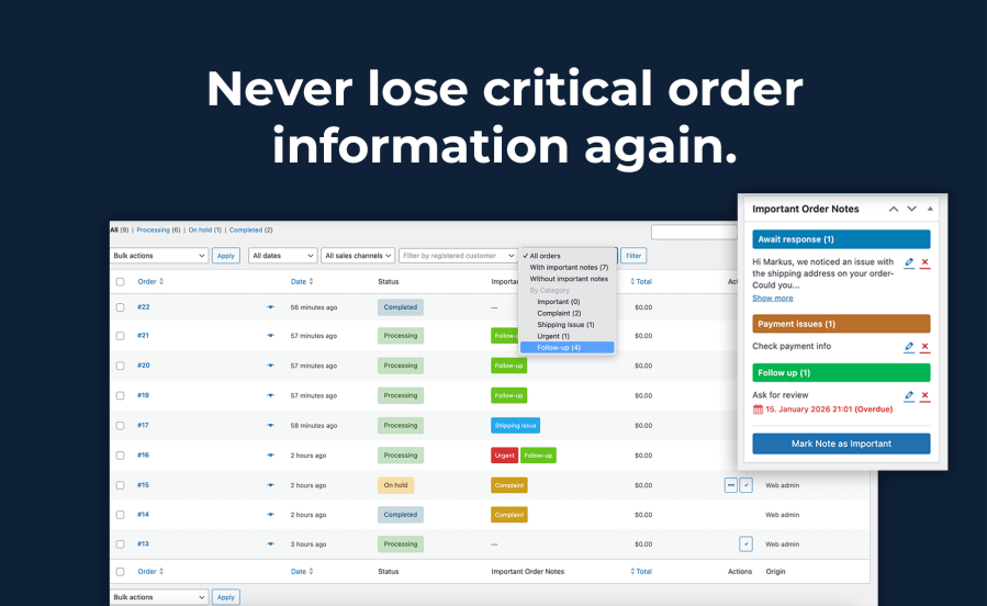 Instead of changing how WooCommerce works, it enhances the order notes you already use by allowing you to mark selected notes as important and organize them visually.
