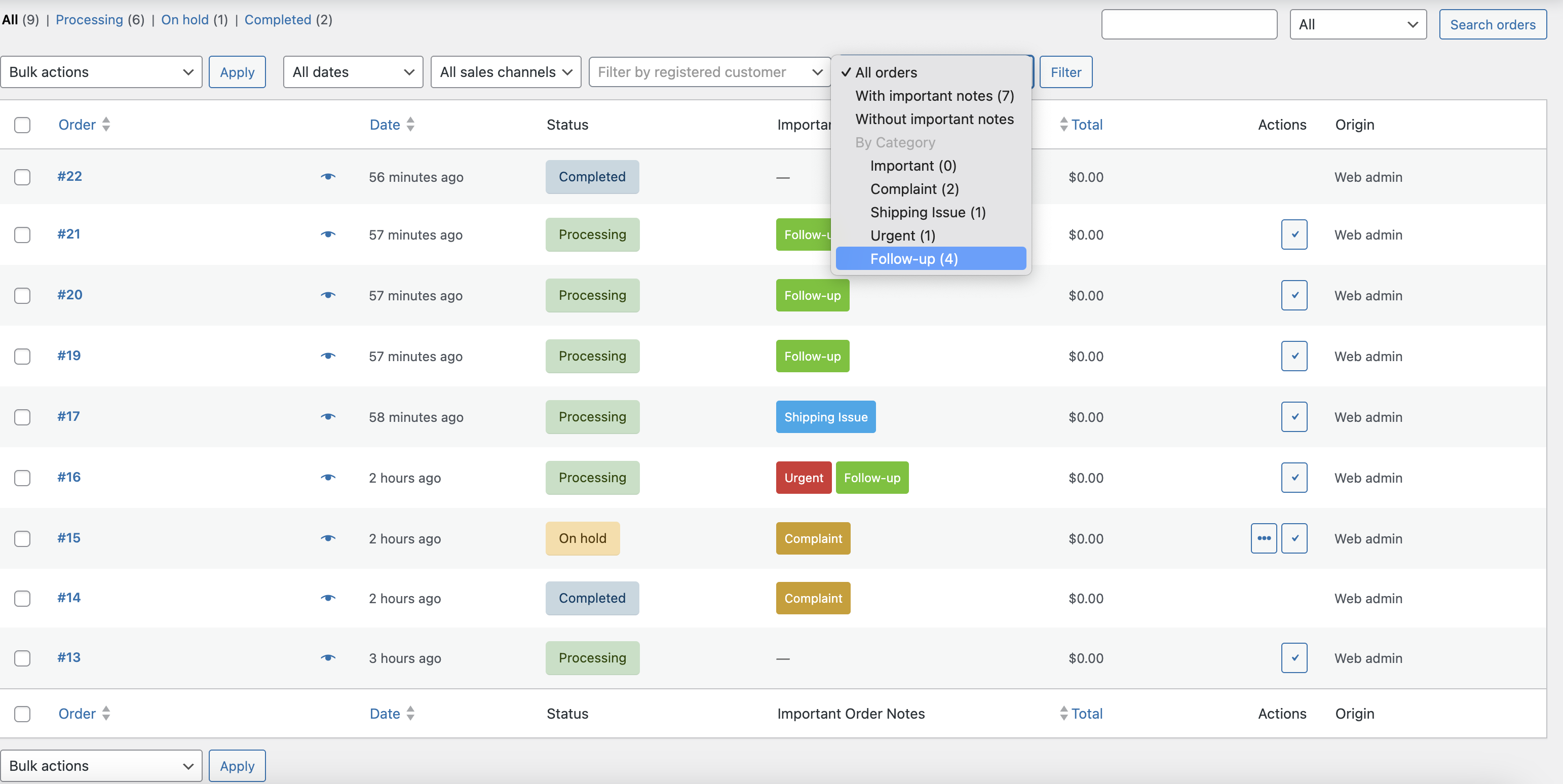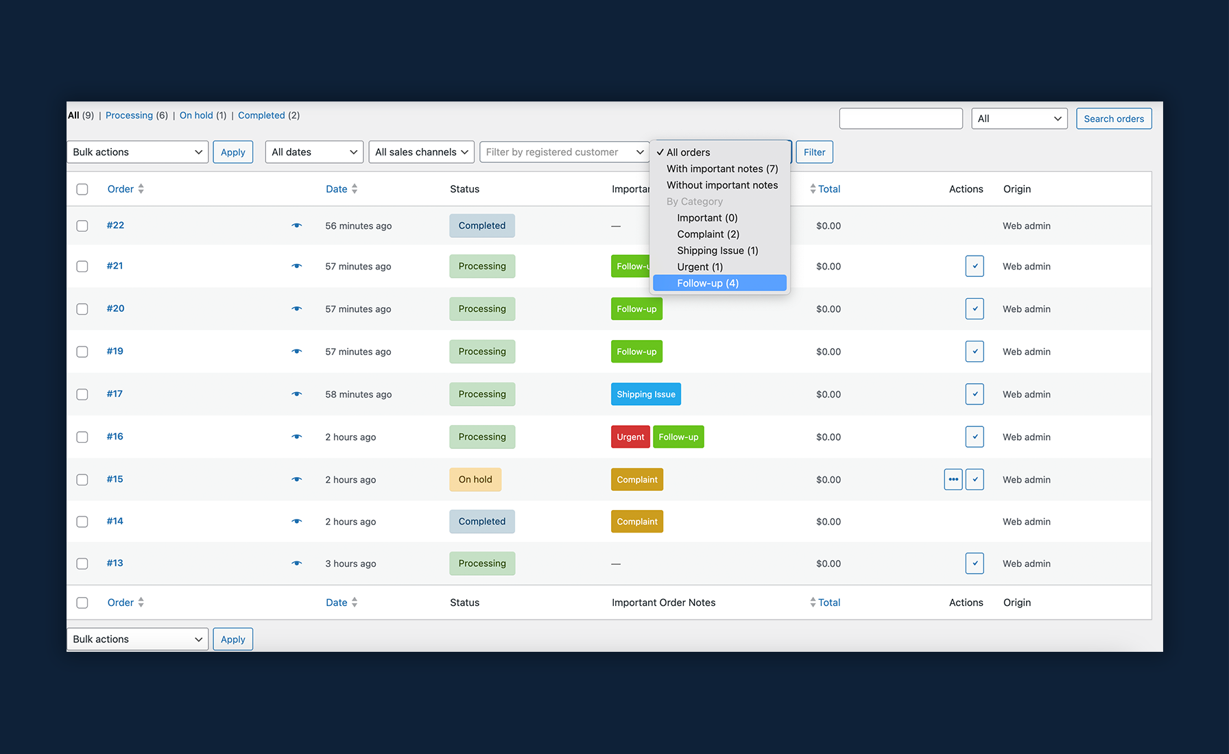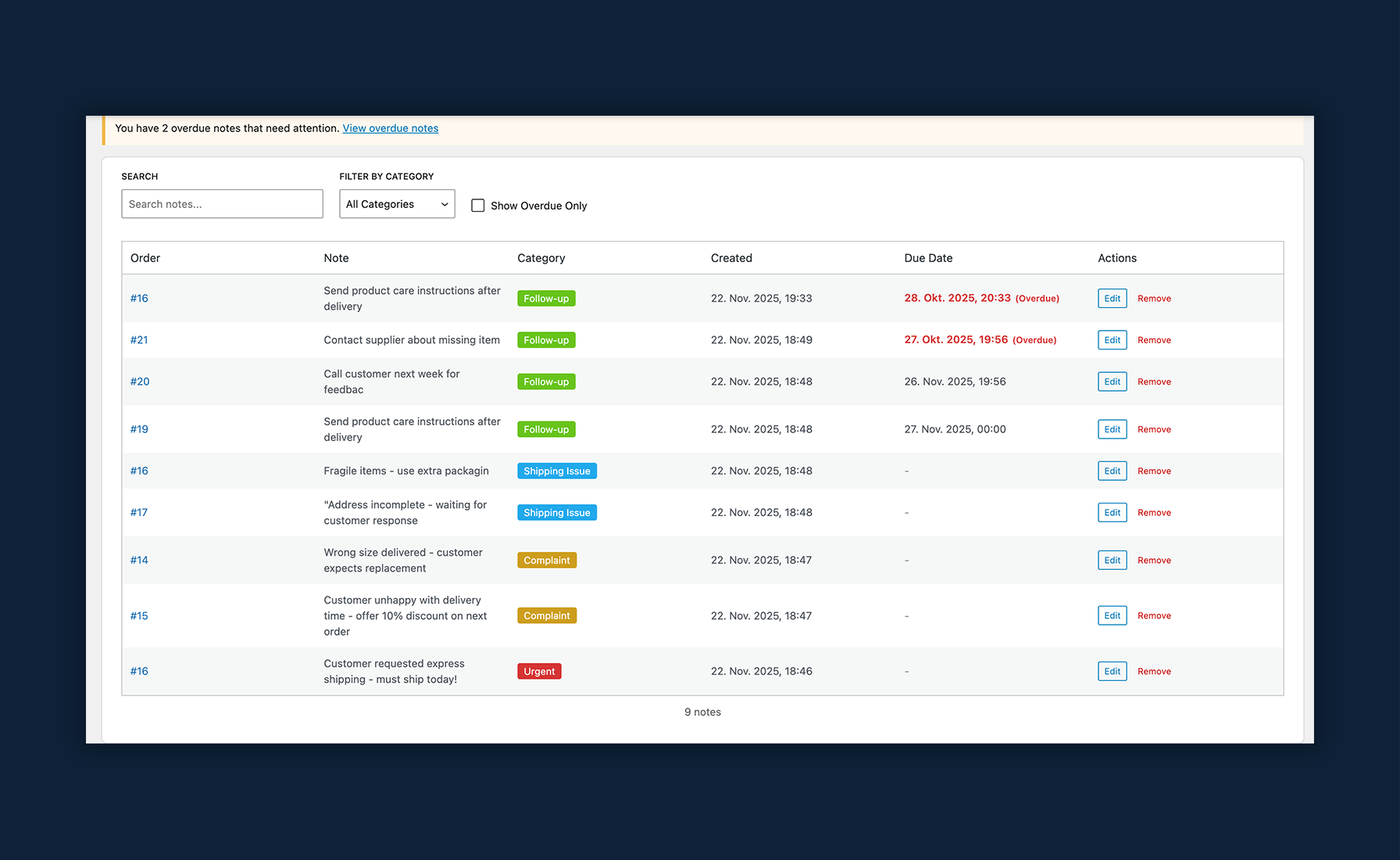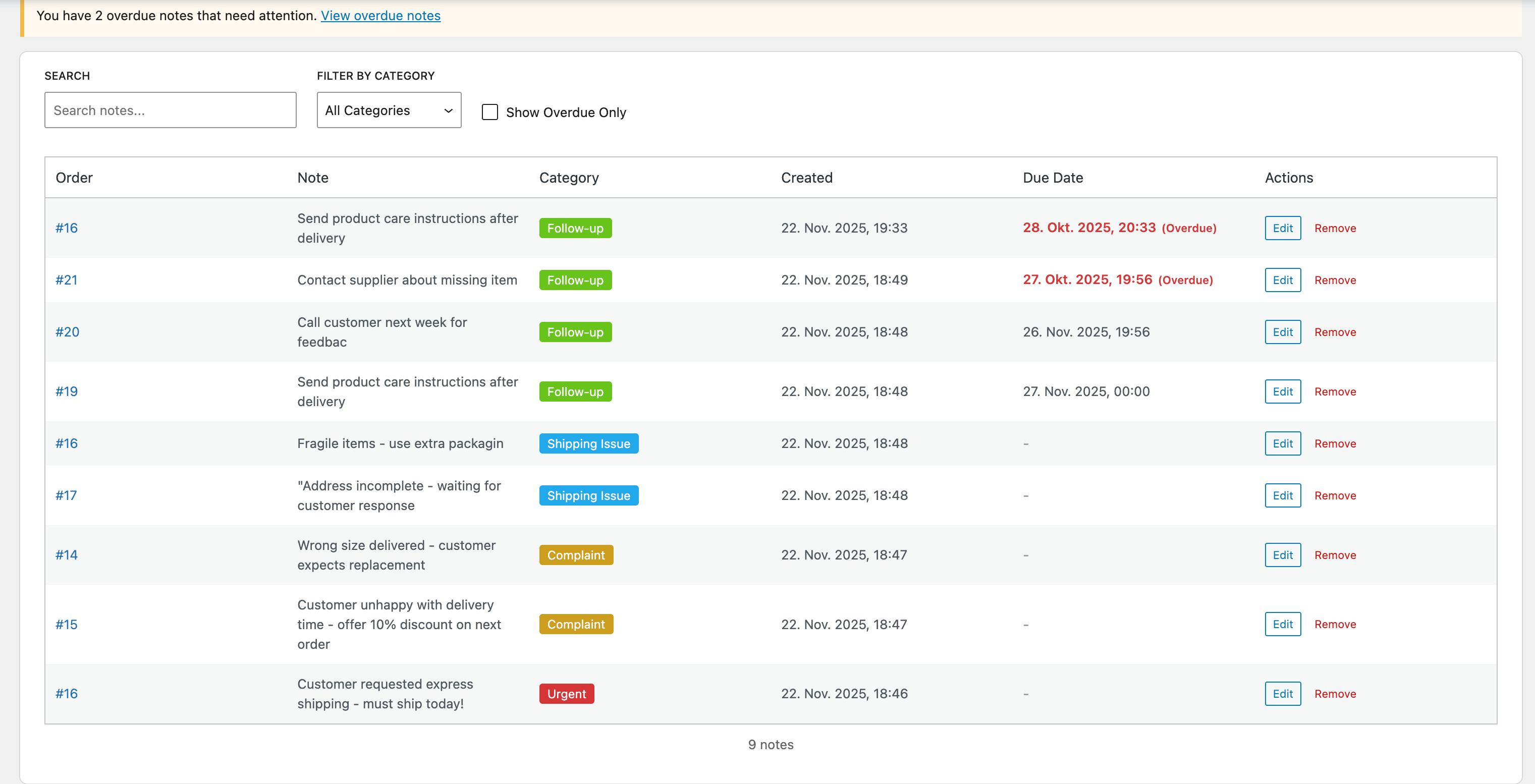 The plugin provides a separate admin page where all important notes from all orders are listed together. You can search through them, filter by category, or show only overdue notes. This gives you a clear overview of everything that requires attention across the entire store.