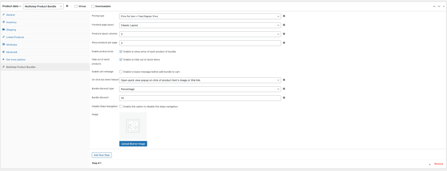 4. Open the Multistep Product Bundles tab to configure pricing type, layout, display options, on-click behavior, optional discounts, and banner images.