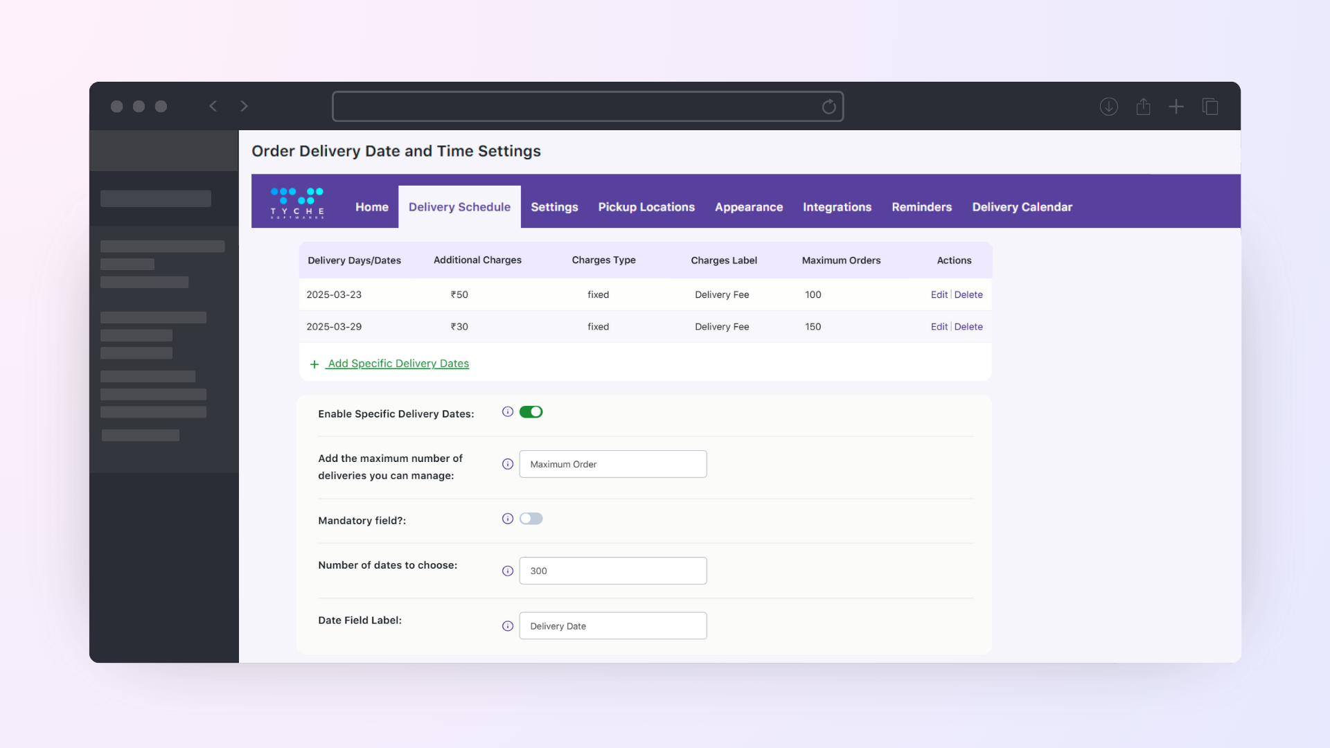 Example: A Christmas tree seller can offer deliveries only on weekends in December, apply an extra charge for holiday eve deliveries, and disable standard shipping on non-delivery days to streamline fulfillment.