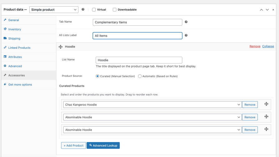 Display curated or rule-based accessories/complementary products in product tabs on your store.