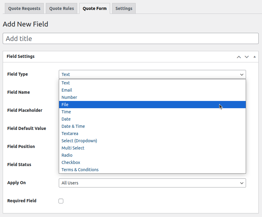WooCommerce request a quote plugin lets you create a custom form by adding as many fields as you need. You can choose different field types and set some fields as mandatory.