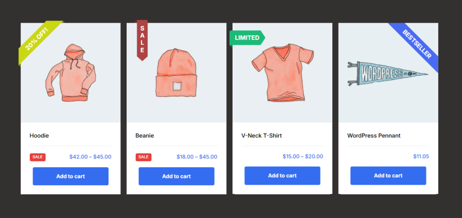 Badges can be displayed as overlays on product images or inline before/after product title, price, or add to cart button on both shop and single product pages.