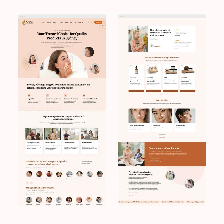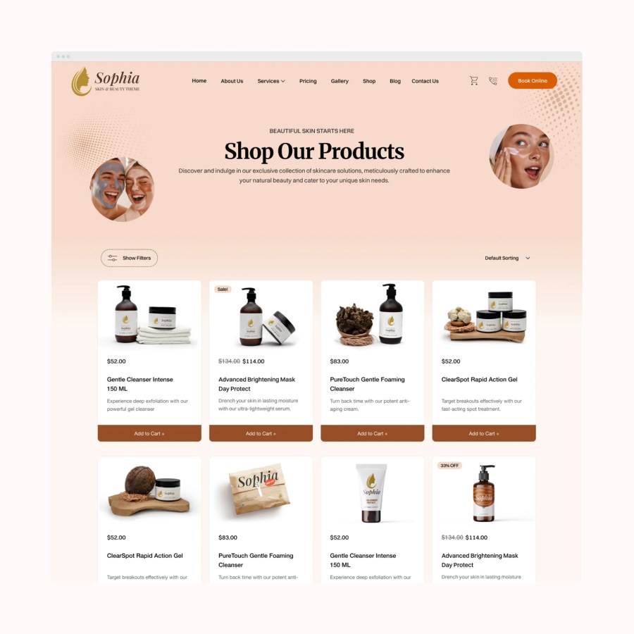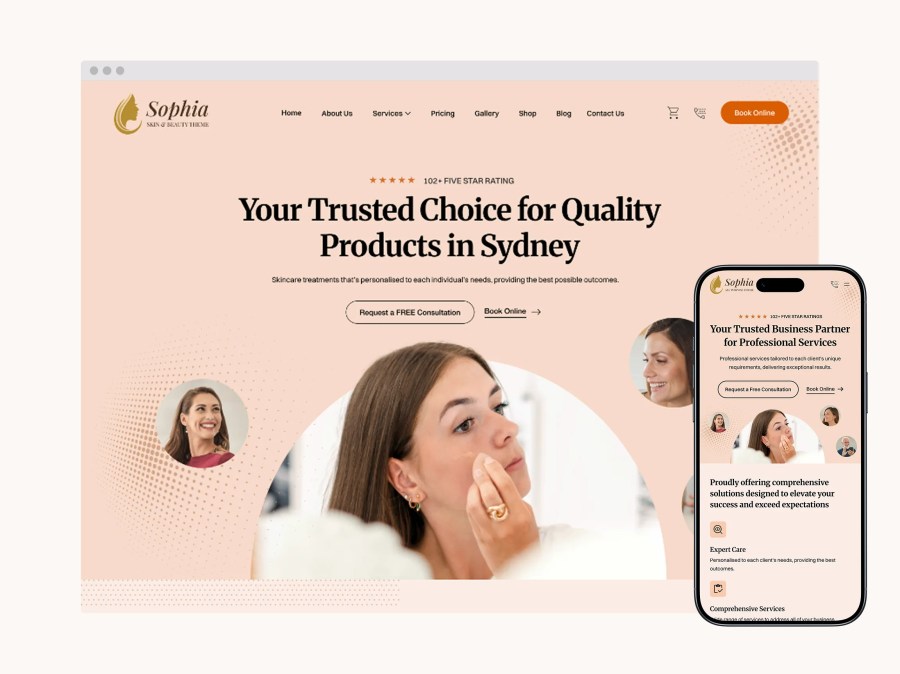 Whether you run a beauty salon, consulting firm, online store, or professional service business, Sophia adapts to your needs. Every layout, feature, and component was designed with service-based and product-based businesses in mind. From interactive galleries to booking integration, it’s all built to help you succeed.