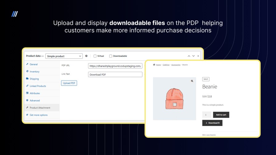 Upload and display downloadable files like product guides, spec sheets, compliance documents, etc. or any other supporting material (PDFs and more). These attachments appear directly on the product page, helping customers make more confident, informed purchase decisions.