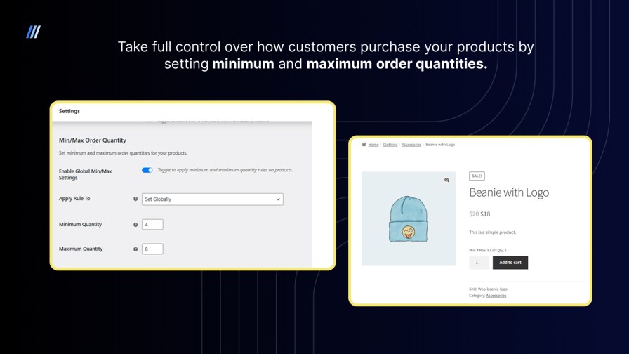 Take full control over how customers purchase your products by setting minimum and maximum order quantities. Whether you’re selling in bulk, managing inventory flow, or enforcing order thresholds for specific products, this feature helps streamline your sales process.