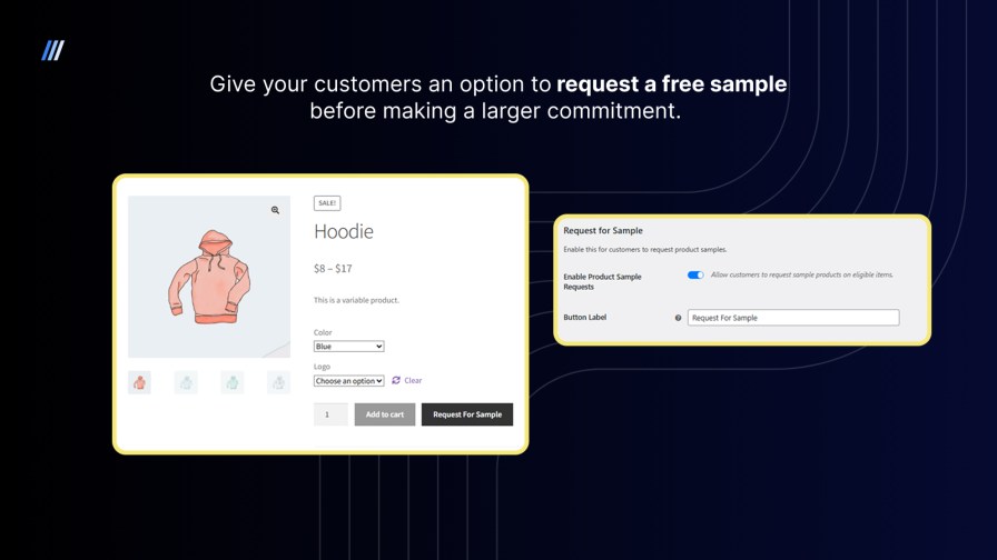 Enable a sample request button on eligible products, giving your customers the option to request a free sample before making a larger commitment. This is especially useful for B2B stores, custom products, or industries where touch, feel, or fit matters—like packaging, printing, apparel, or cosmetics. You can customize the button label to match your brand voice (e.g., “Request Free Sample” or “Try a Sample”), and display it only on specific products where sampling makes sense.