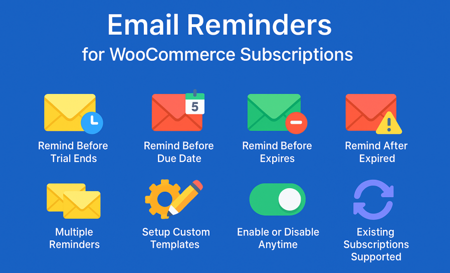 The Email Reminders for WooCommerce Subscriptions extension expands the communication features of WooCommerce Subscriptions.