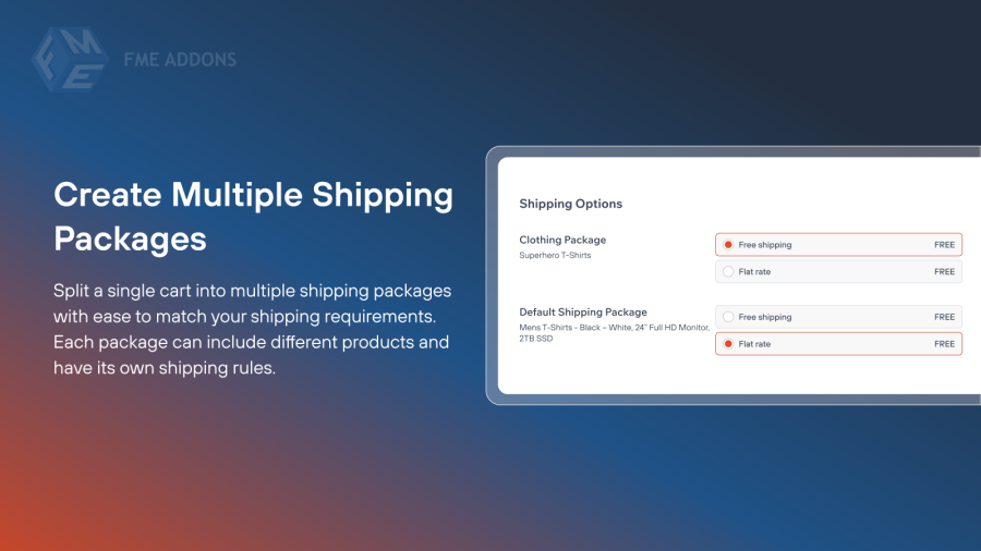 Multiple shipping packages allow you to apply different shipping methods and rates to different products in the same cart. This is useful for handling bulky items, fragile products, or items shipped from different locations.