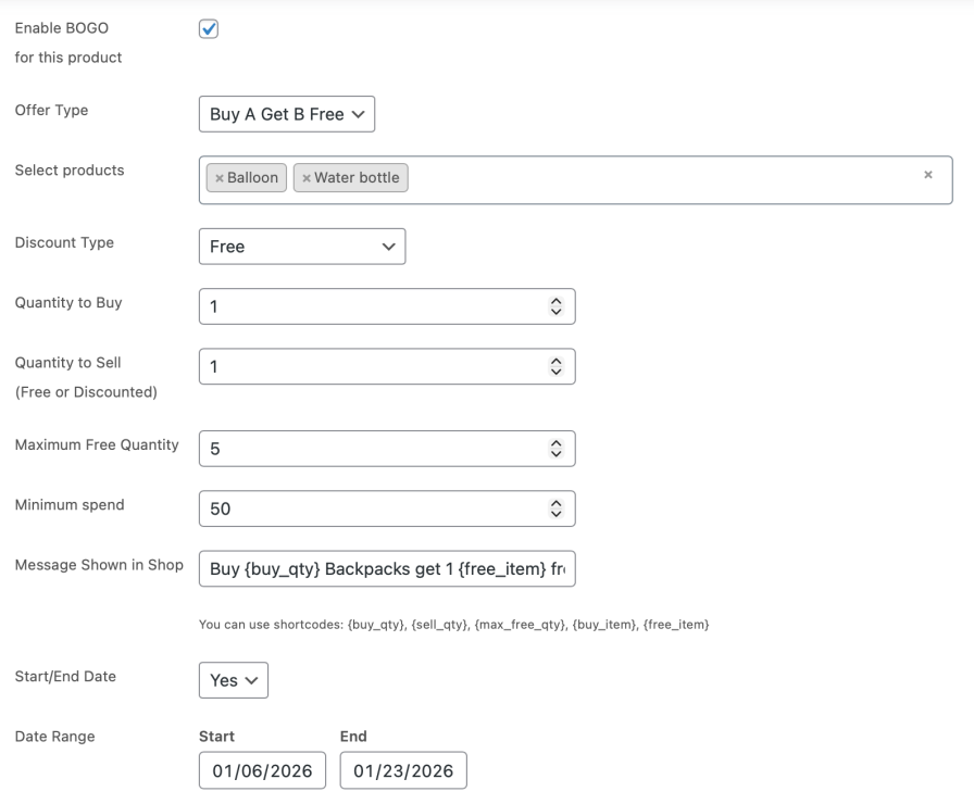 After installing and activating this extension, you have to open the product settings and open the "BOGO" tab. In this tab you can configure how many items you want to give for free, how many have to be bought in order to reach this offer, etc.