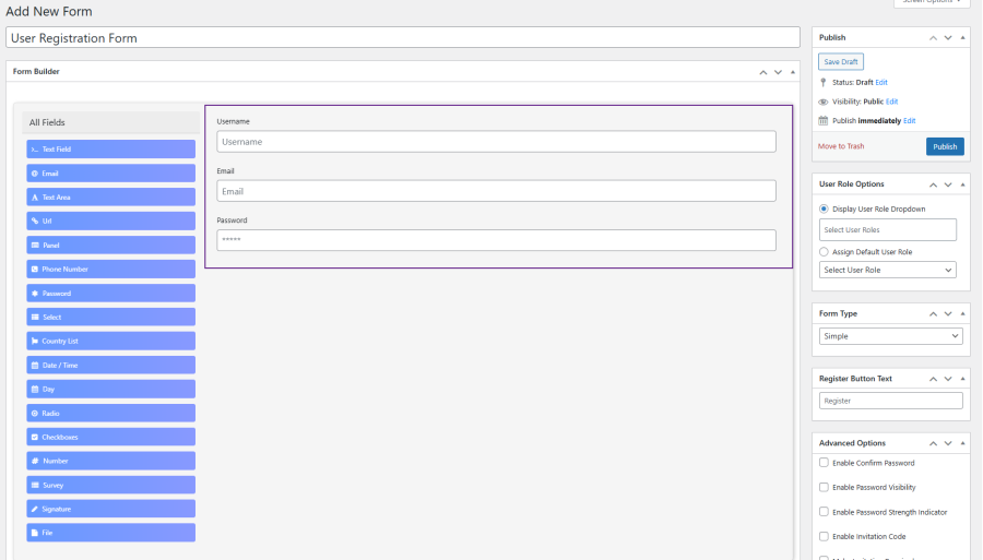 Drag-and-drop input fields and options in the user registration form builder (backend & frontend view)