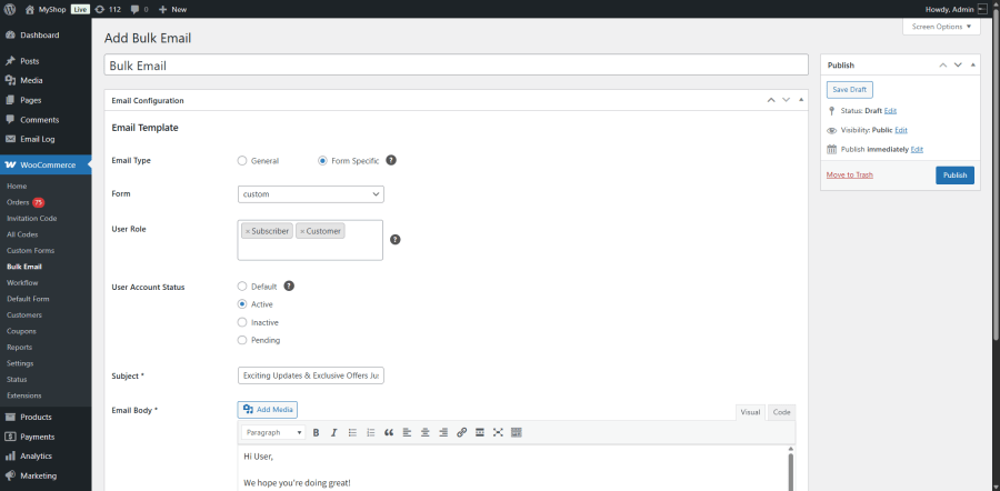 Communicate with multiple users instantly using built-in bulk email tools. Send targeted messages based on user roles, registration forms, or account status. Perfect for onboarding campaigns, announcements, promotions, or updates, all managed directly from your WooCommerce dashboard.