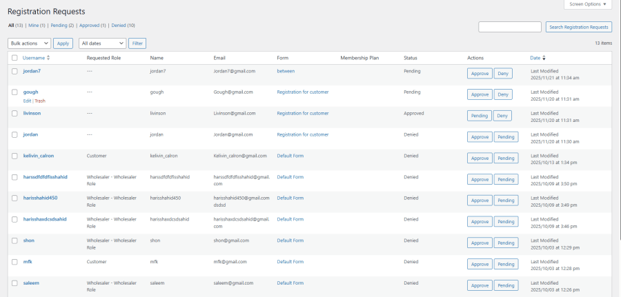 Pending or denied users cannot log in — they receive your configured message on the login screen.