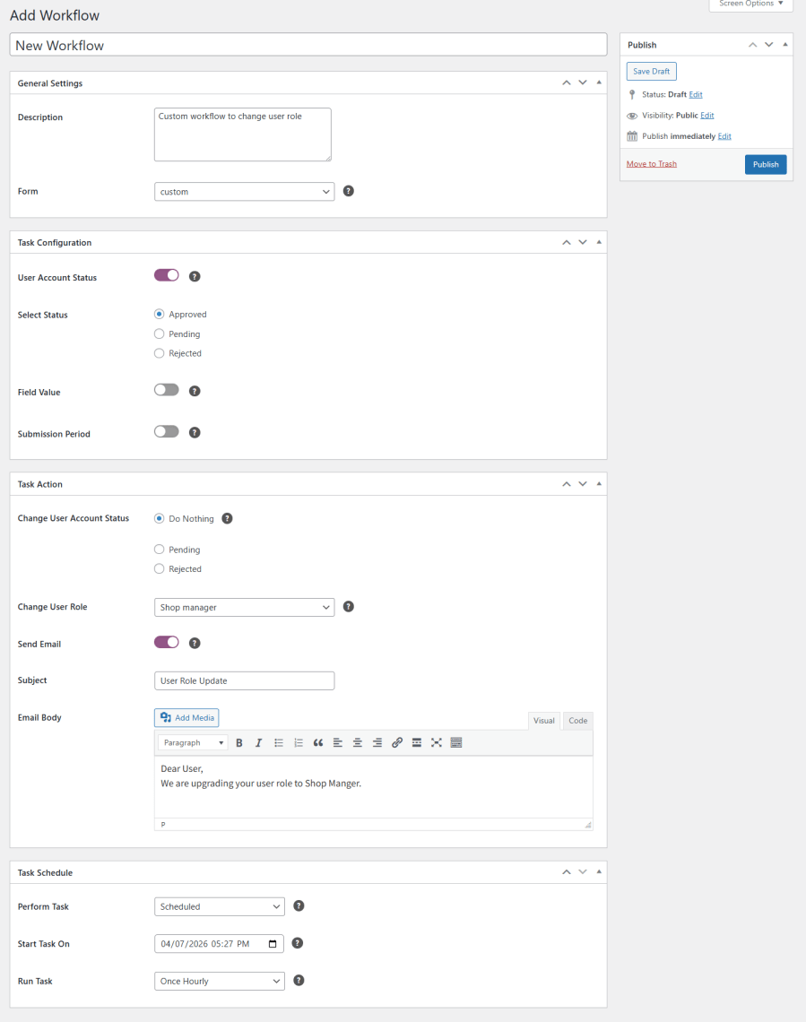 Simplify multiple actions simultaneously — including updating user roles, changing user status, and more. Execute tasks instantly or schedule them. Each workflow rule configures: