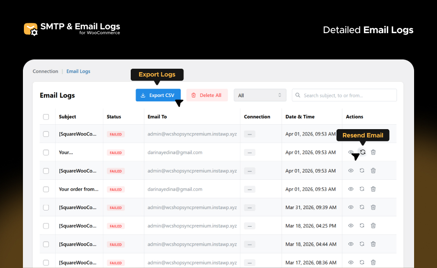 Track delivery status, view detailed logs, and resend failed emails — all from your WooCommerce dashboard.